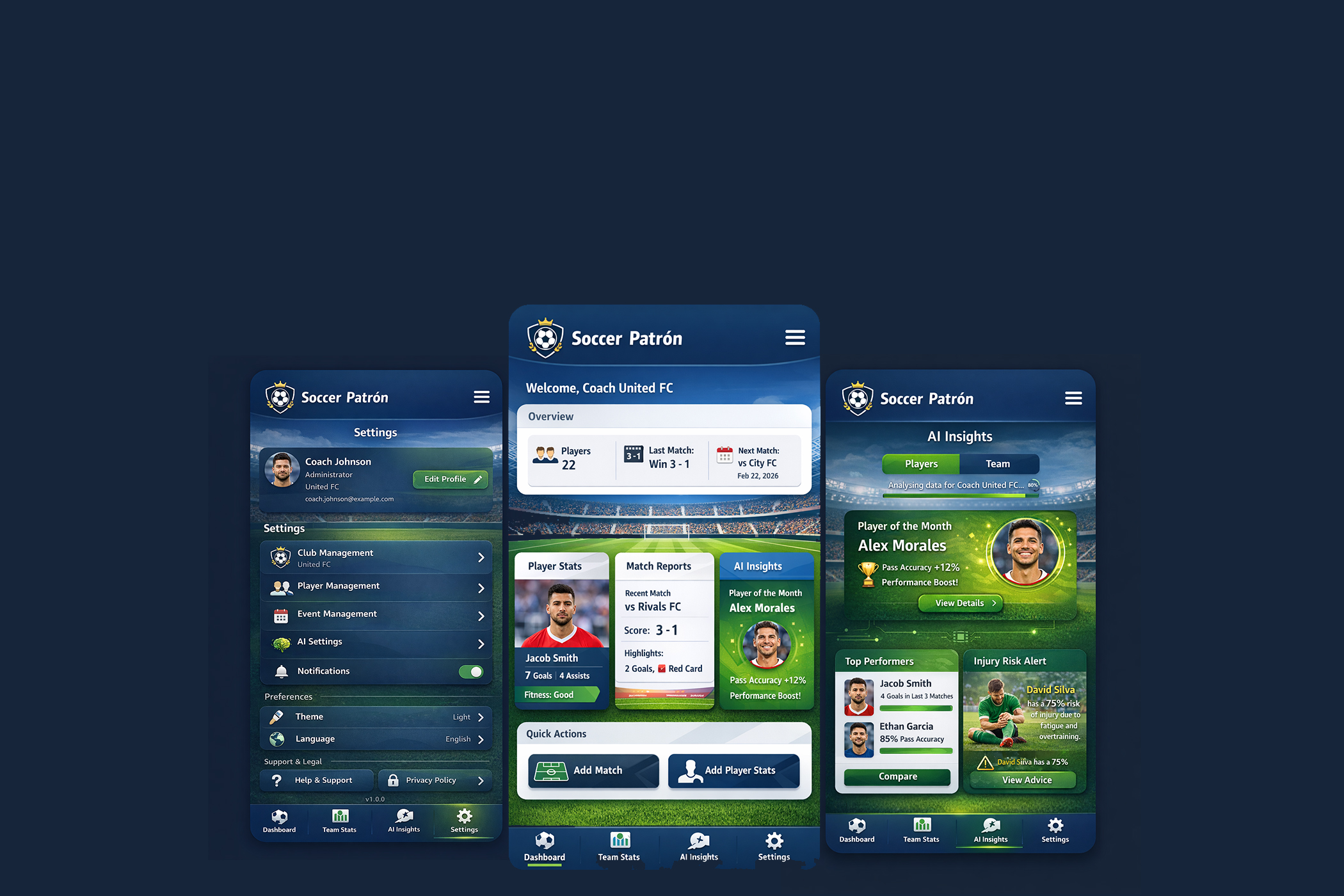 Soccer Patrón is a self-contained football club analytics Android application built using Jetpack Compose. The platform enables football clubs to register, manage teams and players, input match data manually, and receive AI-powered insights without relying on external football data sources.